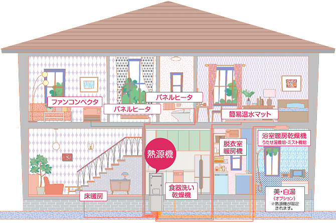 給湯機能に加えて、暖房や乾燥のための温水をつくり、循環させます。