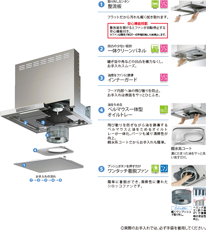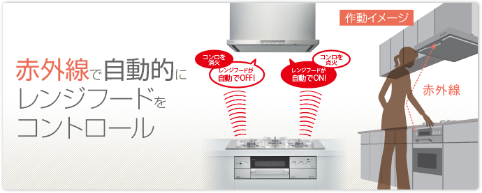 コンロを点火すると、レンジフードが自動的にON、消火すると3分後に自動でOFFします。 換気ファンのつけ忘れ、消し忘れを解消できます。