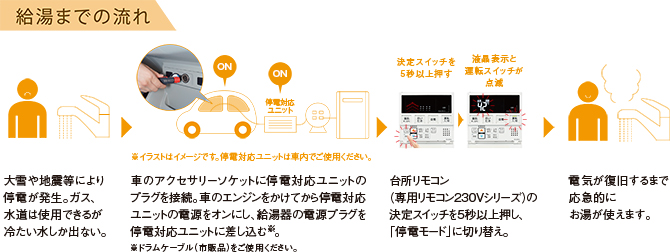 停電が発生した場合でも、ガスと水道が使用可能であれば、「停電対応ユニット」を用いることで、応急的にお湯を使うことができます。