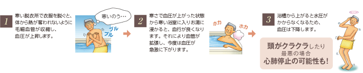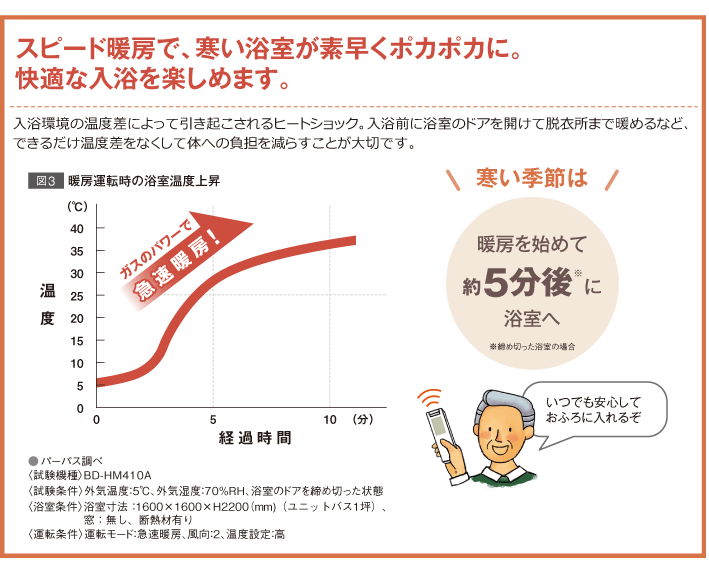温水の力で浴室をすばやく暖めます。冬場に多く発生する「ヒートショック(※寒い浴室と熱いお湯の温度差による急激な血圧の変動)」の予防に効果的です。